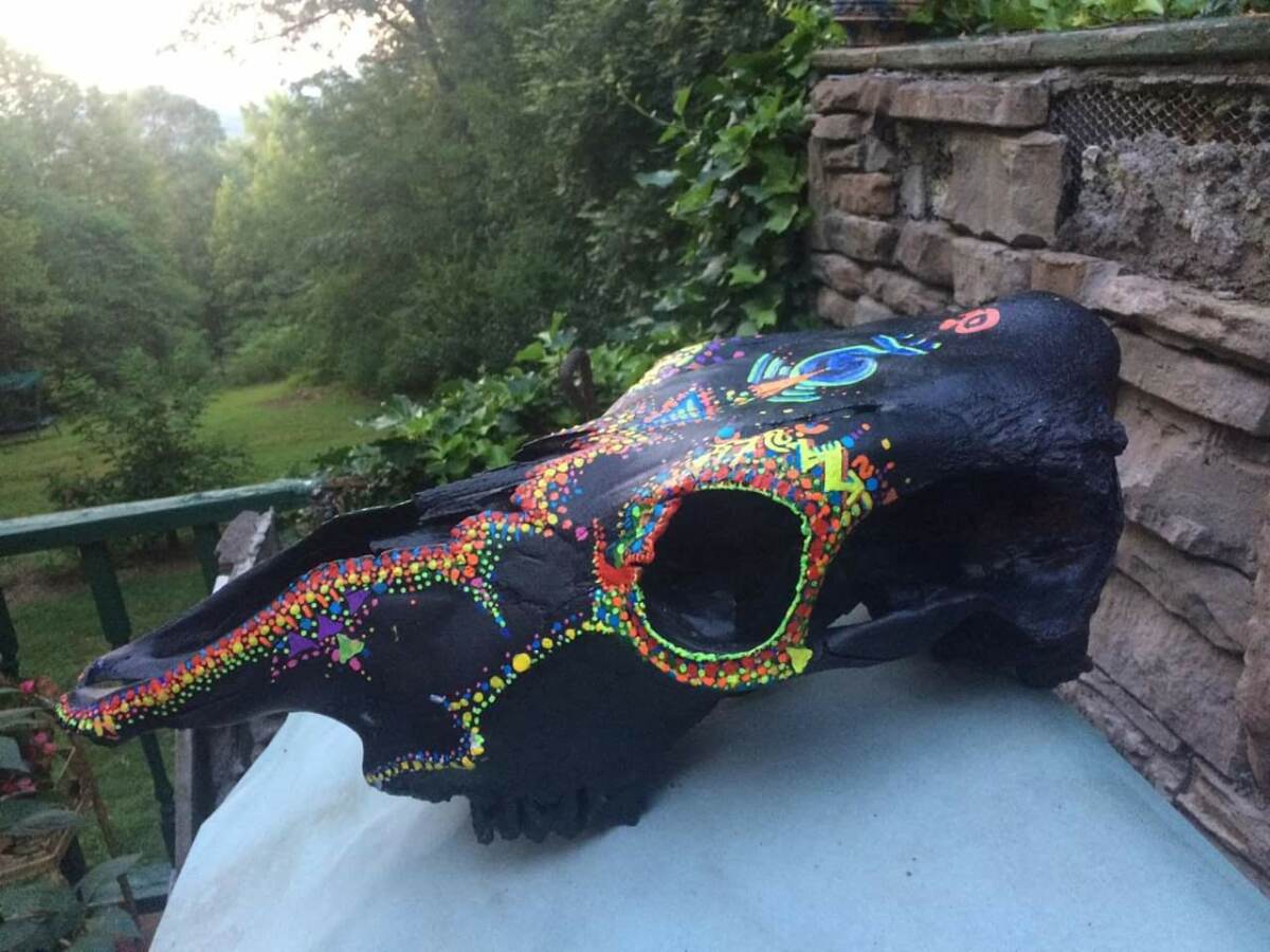 Hand painted Day of the Dead cow skull created very meticulously with the intention of pateince.
