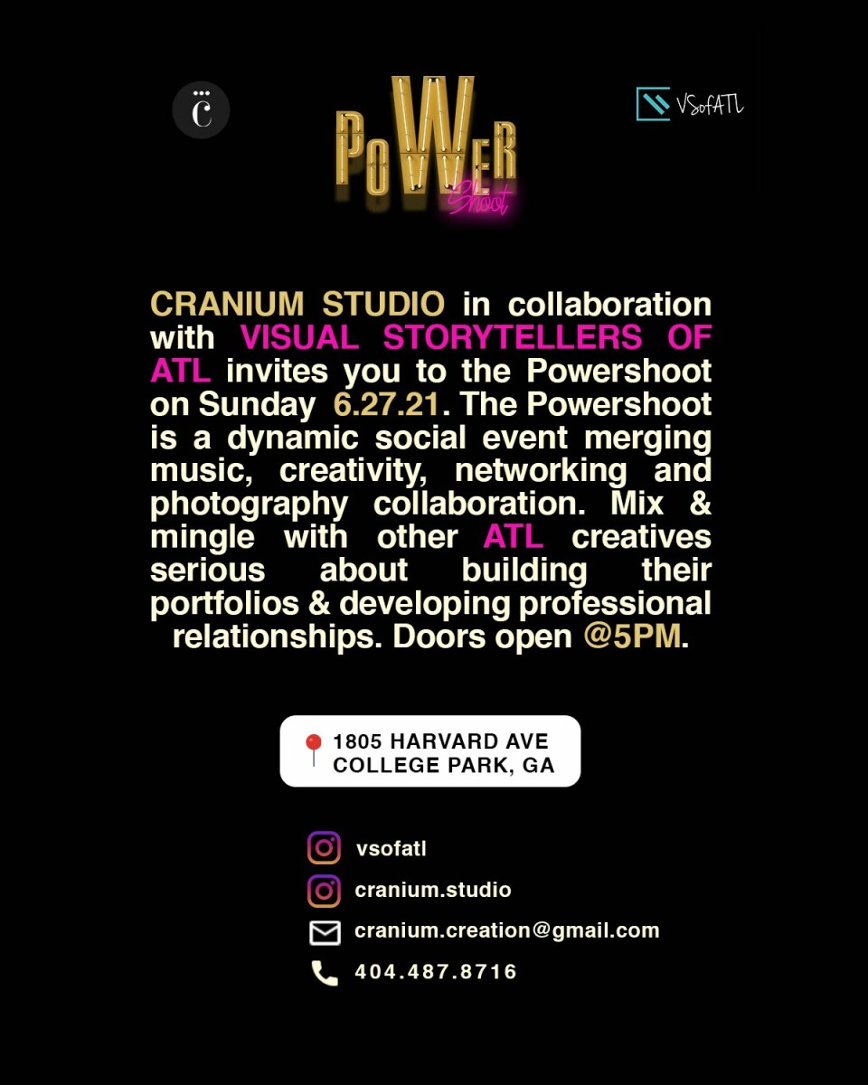 Visual Storytellers of Atlanta, in collaboration with Cranium Studio, is hosting The Power Shoot on Sunday, 6.27.21. The Power Shoot is a dynamic social event merging music, creativity, photography collaboration, and networking. Mix & mingle with other ATL creatives serious about building their portfolios & developing professional relationships.