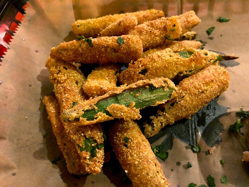 The sandwiches are easily enough for two with a side. And you do want to try other dishes. I particularly love the crunchy okra fried in a breadcrumb batter and served with a house-made peri-peri sauce. (It’s much milder than you might expect.) The empanadas I’ve tried have been amazing, not just because the roomy interior is lusciously filled with chicken, pork, or veggies, but because the pastry is so fresh. Ditto for the tostones — yellow and brown mandalas dusted with sea salt and served with aioli. During both my visits I’ve missed the more complex specials like mofongo — a Puerto Rican favorite — with shrimp and peri-peri sauce. I haven’t tried it yet but the one dessert item during my visits has been an empanada that includes guava and cream cheese — something I totally burned out on after five years of marriage to a Cuban woman a century ago. An alternative is the Oaxacan-style, spicy hot chocolate topped with marshmallows that Kevin set on fire at my table. If ayahuasca tasted good, it would taste like this.