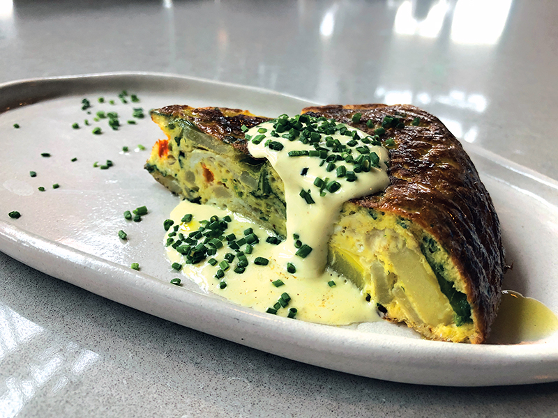 Another tapa that is ubiquitous is the Spanish-style tortilla — a wedge of a thick, browned omelet usually packed with creamy potatoes. Here, the kitchen uses a changing variety of vegetables in addition to the potatoes — namely red peppers, zucchini, onions, and kale during my visit. The omelet was topped with a spoonful of intensely aromatic aioli that drizzled into a pool on the chive-scattered plate. Next up was a serving of three piquillos stuffed with Georgia goat cheese. You’re going to immediately notice a fruity taste. That’s because the kitchen uses Arbequina olive oil from Catalonia, complemented by an acidic shot of lemon. The piquillos are crazily scattered with fried chickpeas — a really ingenious foil for the creamy textures. The dinner menu includes many vegetarian and vegan choices, including Beyondigas — albondigas (meatballs) made with Beyond Meat. There are also seafood and meat tapas including a Sevilla-style hot chicken. I mean …. Basta with the hot chicken! There are three major items for the table — a roasted chicken, a gigantic rib eye, and a whole fish.