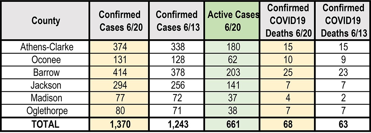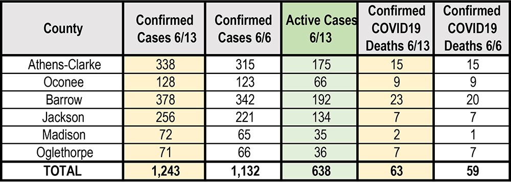 While active cases have increased in Greater Athens in the past week, the pace is about half of the increased cases appearing in the five Atlanta core counties. Over the past week, three additional individuals died either directly or indirectly from COVID-19, and those deaths took place in just one county, Jackson County.