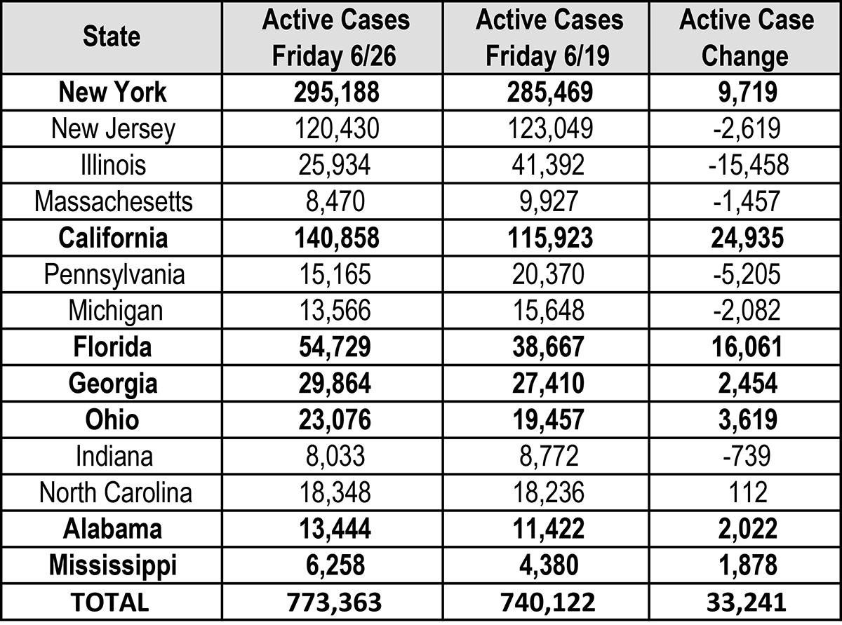 Below is a breakdown of the number of active cases as of 12:01 a.m. this morning, and one week ago, Friday, June 5. There are dramatic declines of active cases in states like Illinois and Massachusetts. Cases in New York, New Jersey Michigan and Pennsylvania posted significant declines one week ago. The number of active cases in Georgia, Florida and Ohio are based on the 14 day cycle used by Washington and the vast majority of States.