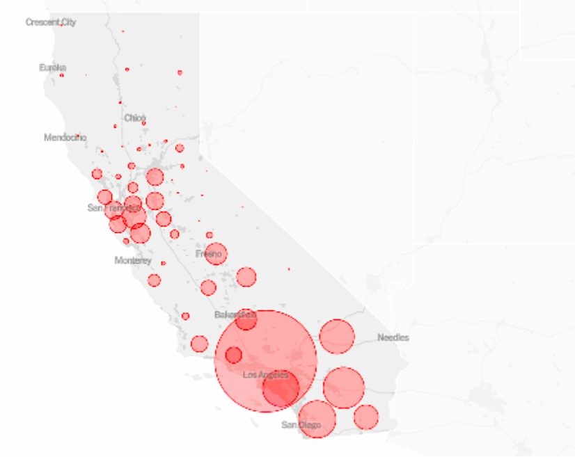 Here is a map of California that ran in the New York Times of the case fall-out across that state. Not only is LA the largest city in California, but Los Angeles County is where the vast number of new COVID-19 cases are being tracked.