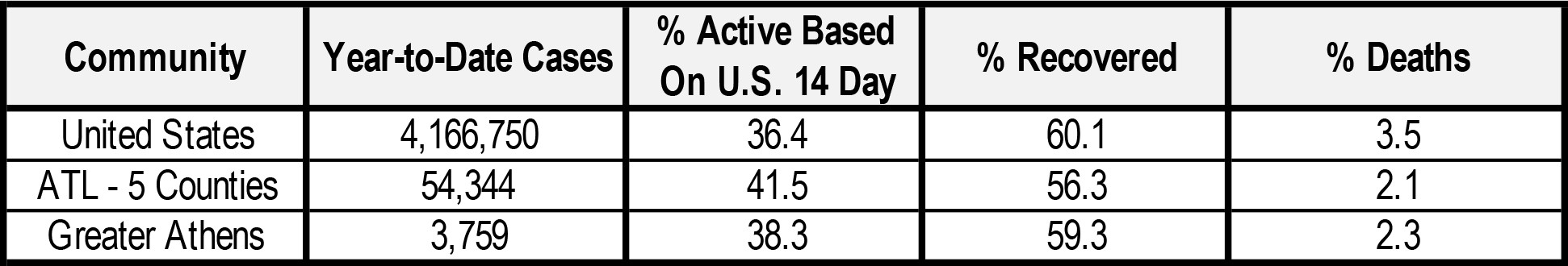 Tomorrow I will highlight the COVID-19 status in the five core counties of Atlanta and the six counties that make up greater Athens. The Georgia Department of Public Health is now issuing the number of new cases from the last two weeks in addition to total cases. The number of new cases from the last two weeks is actually the number of ACTIVE COVID-19 cases based on the 14-day U.S. universal recovery time. In most of the counties, the calculations I have reported have tracked very close; however, there are a number of the Atlanta counties that are actually posting lower active cases than my calculations indicated.