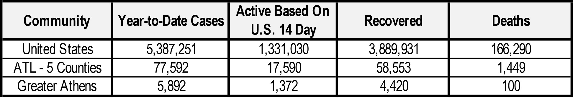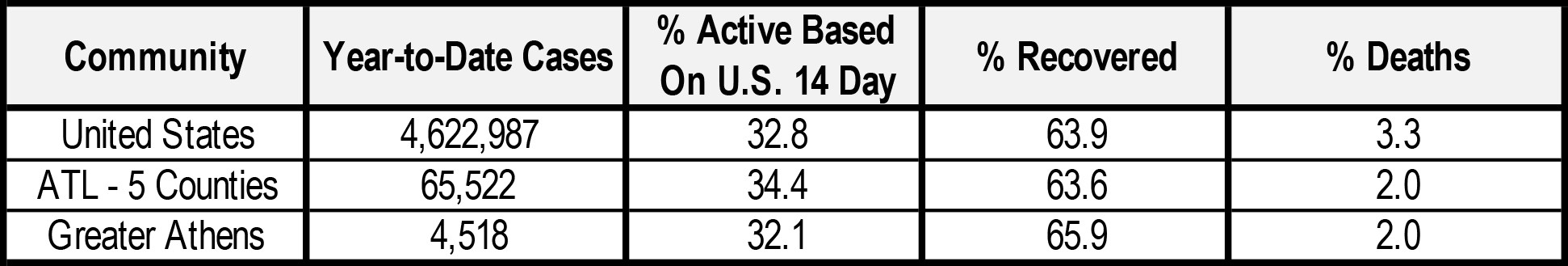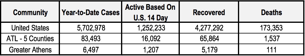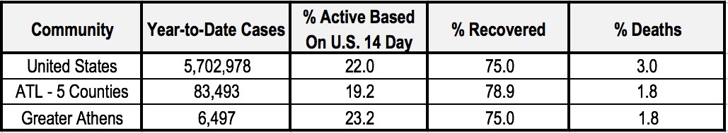 The number of cases year-to-date in the six greater Athens counties account for 2.4 percent of the 186,352 COVID-19 cases tracked to-date statewide in Georgia. As a group, the six greater Athens counties account for 3.4 percent of the Georgia population.