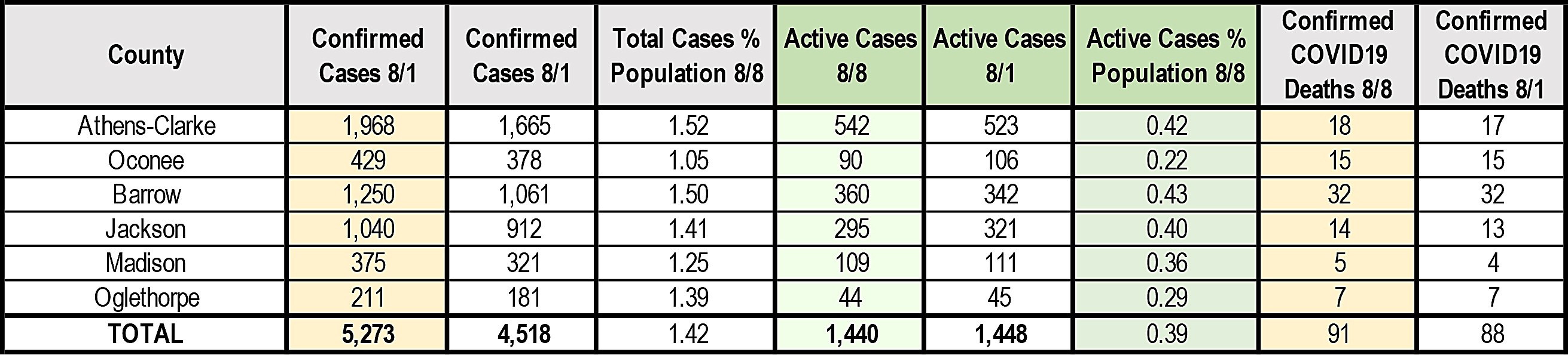 Here is a specific breaks of the stats for the greater Athens six counties. The number of active cases has declined in Athens-Clarke County, Oconee and Oglethorpe counties as compared to the active count posting last Saturday July 25.