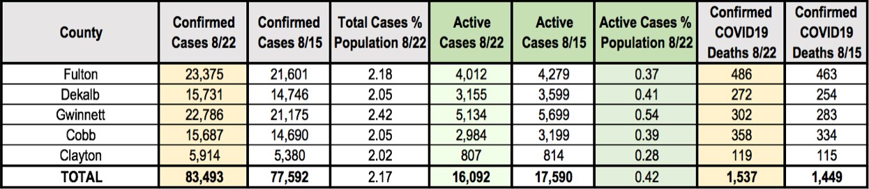 The number of cases year-to-date in the five Atlanta counties account for 35.1 percent of the 186,352 COVID-19 cases tracked to-date statewide in Georgia. The five Atlanta counties account for 35.7 percent of the Georgia population.