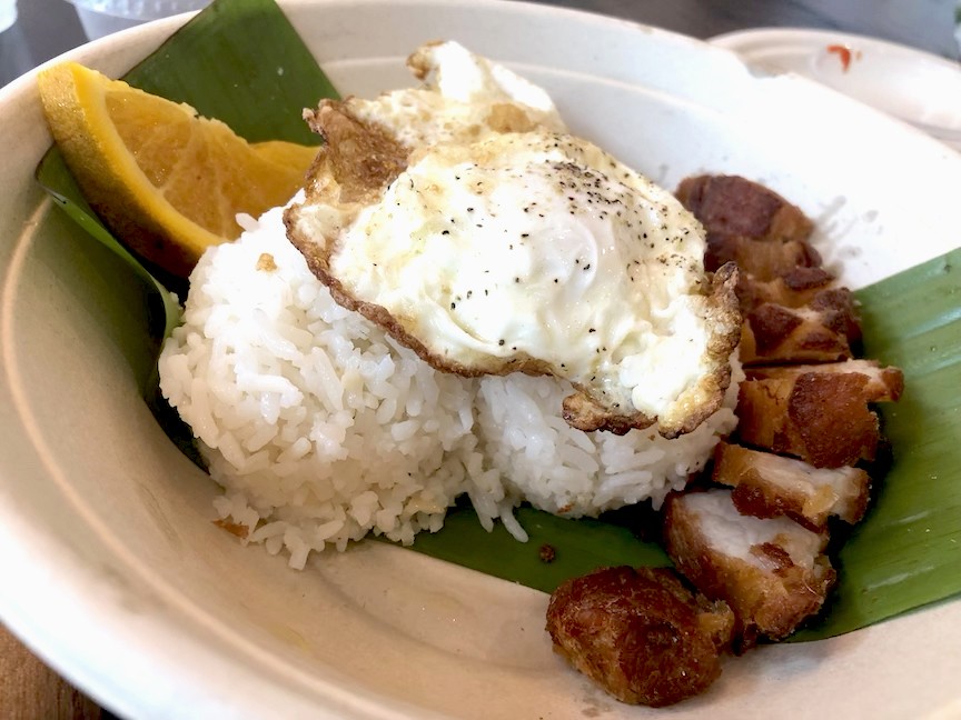 Estrellita (“little star”) is open for dinner every evening except Tuesday. I visited on a Saturday afternoon when brunch is also served. I only got to try three dishes, but I’ll definitely be returning. My starter reflected the long Spanish occupation of the Philippines — a torta of creamy eggs, onions, and potatoes on a really delicious pandesal bun. My entrée was the soon-to-become notorious P.I.G. plate. That stands for pork, itlog (egg), and garlicky jasmine rice. The pork was fried and crunchy, sort of like carnitas, and the egg was likewise fried and served atop a huge serving of the rice. While I quickly polished off the pork and egg, I left a good bit of the rice behind, prompting Cortado to say, “I see you’re not that much into carbs.” Honestly, I don’t question the plate’s authenticity, but, hell yes, I wanted a lot more of that pork. I also ordered dessert — two large scoops of ice cream made of ube, a purple yam. It was accompanied by four lumpia, spring rolls filled with plantains. This was obviously meant for two but you will want to relieve your pandemic anxiety by eating the whole damn thing by yourself. The menu offers other classic Filipino dishes like shaved beef (bistek), fried pork belly, lo mein-like noodles, stews, and lumpia with savory fillings. Cortado also regularly prepares specials. My only complaint was the sauces, especially a super-sweet banana ketchup that had no banana flavor. I didn’t care for another cloyingly sweet condiment that reminded me of apple sauce. Cortado rescued me from these by offering a tart soy vinegar. Much better.
