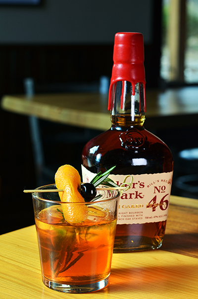 Maker's Mark 46, rosemary and brown sugar, simple syrup, Angostura and orange bitters, garnished with Luxardo cherry, rosemary sprig and an orange swath.