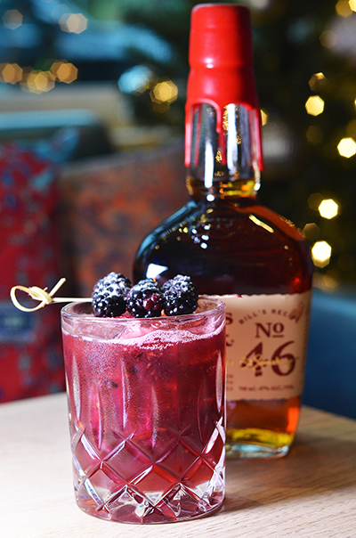 Maker's Mark 46, rosemary & sage simple syrup, lemon juice, orange bitters, blackberries on the rocks with blackberry garnish.
