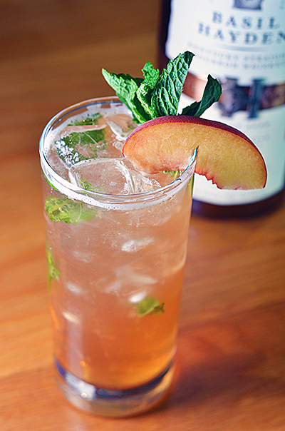 Basil Hayden Whiskey, simple syrup, 3 mint leaves, one peach slice, muddled mint and peach (together), shaken and topped with Club soda.