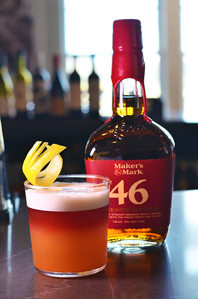 Maker's Mark 46 French Oaked Bourbon, Béarnaise oleo (lemon, lemongrass, tarragon, black peppers, cayenne pepper) dry white wine reduction (infused with shallots and tarragon) egg white, salt, pepper and cured egg yolk shaved on top.