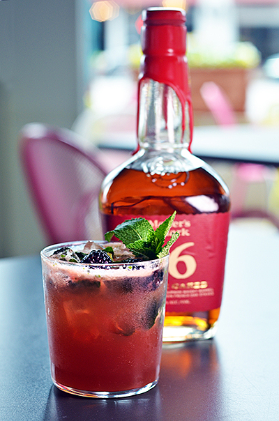 Maker's Mark 46, blackcurrant liqueur, lime juice, agave, 5 mint leaves - muddled, 1 lime - muddled and topped with ginger beer.
