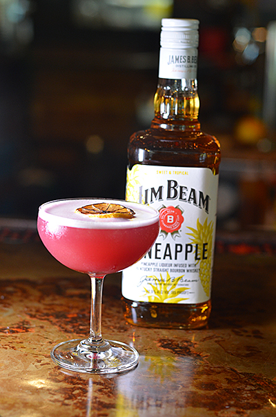 2 oz. Jim Beam Original, 1 oz. lemon juice, agave, 1.5 oz Pineapple, 3 dashes of Fee foam, topped with simple syrup. garnished with an orange slice.