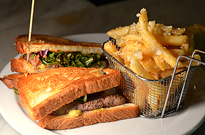 A Perfect Night pairs deliciously with The Albert's Steak Sandwich with Parmesan Truffle Fries, Toasted white bread, bacon jam, arugula tossed in spices and lime juice, marinated steak (medium rare), red onion, swiss cheese and spicy brown mustard.