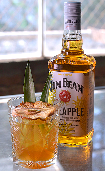 2 oz. Jim Beam Pineapple Bourbon, .25 oz. Tiki syrup (clarified pineapple, lime, coconut, palm sugar), .25 oz. Allspice dram, 2 droppers of Bittermens elemakule tiki bitters garnished with an expressed pineapple slice and a pineapple leaf.