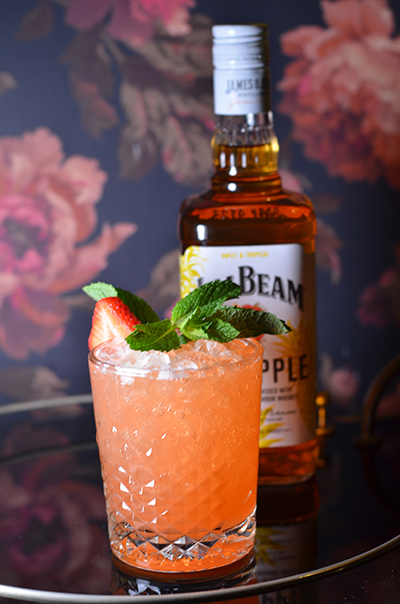 Jim Beam Original Bourbon, Port, lemon, ginger and rhubarb bitters garnished with fresh Strawberry and mint.