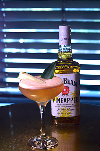 Jim Beam Pineapple Bourbon, house made pepper/pineapple syrup, ginger syrup, lemon, honey, Alma Tepac liqueur garnished, with fresh pineapple and pineapple leaf.