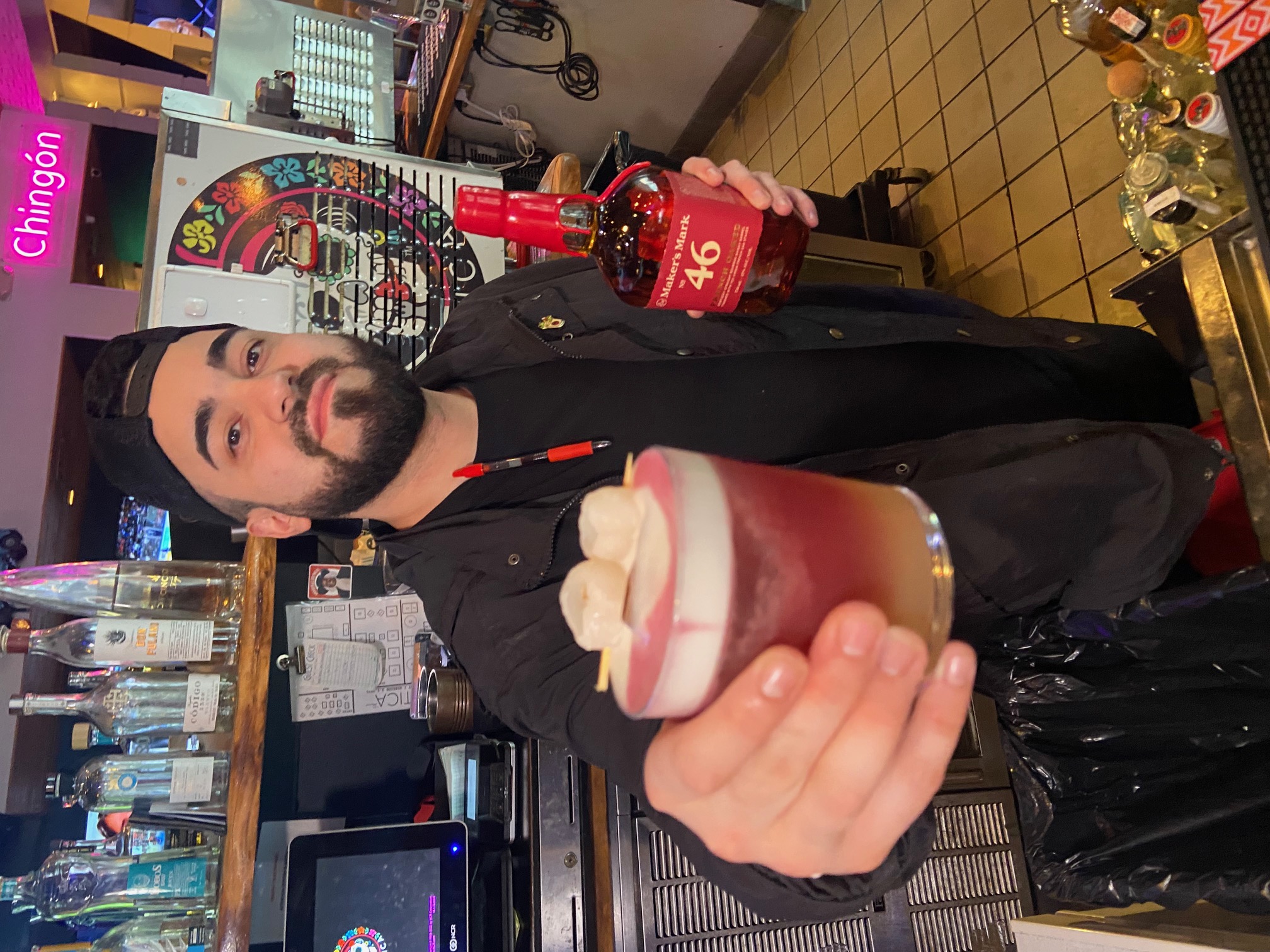 2 oz Maker's Mark 46 French Oaked Bourbon Whisky, 1 oz Lemon juice, .5 oz Agave, .75 Lychee puřee, 1 egg white and Black Stallion Cabernet Sauvignon.